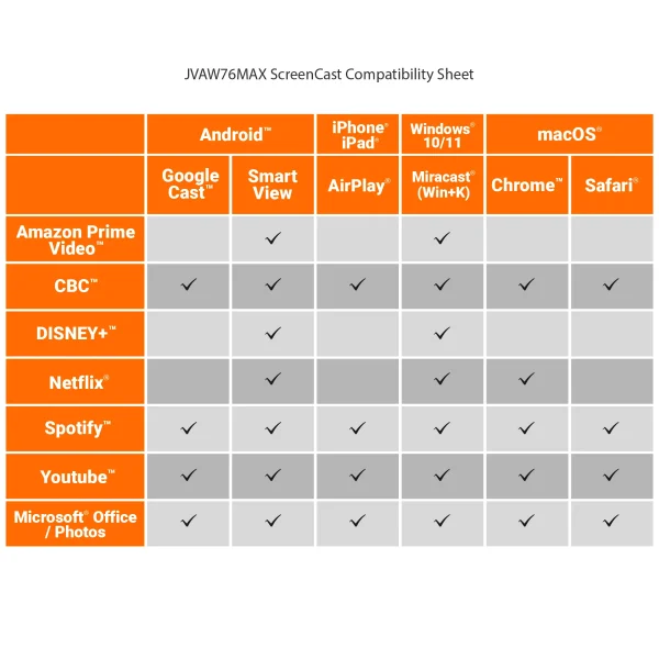 Uz podršku za više standarda bežičnog prikaza, ScreenCast 4K Max kompatibilan je s više uređaja i operativnih sustava kompatibilnih s Castom, uključujući Windows®, macOS®, Chrome OS, Android™ i iOS®