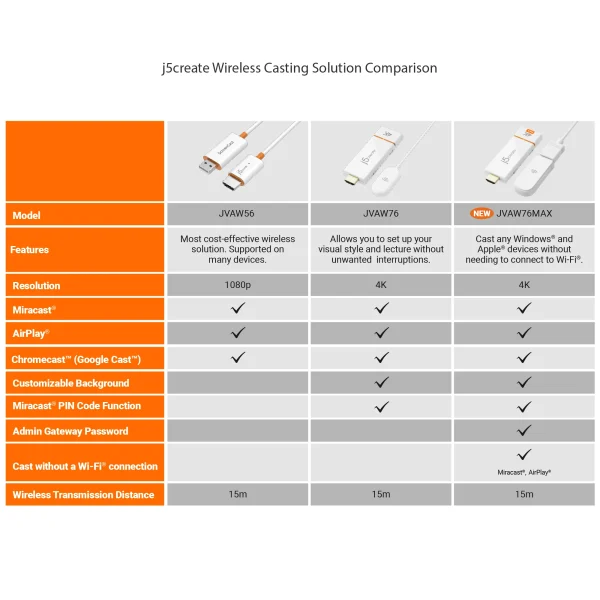 JVAW76MAX dodaje više značajki za poslovne ili obrazovne scenarije, kao što je Point-to-Point način (koristite svoj Windows® uređaj, Mac®, iPad® ili iPhone® bez postavljanja Wi-Fi® veze). Prilagodljiva pozadinska slika daje vam mogućnost da bolje izrazite svoj korporativni identitet. Uključuje značajku Miracast™ PIN koda za dodatnu sigurnost.