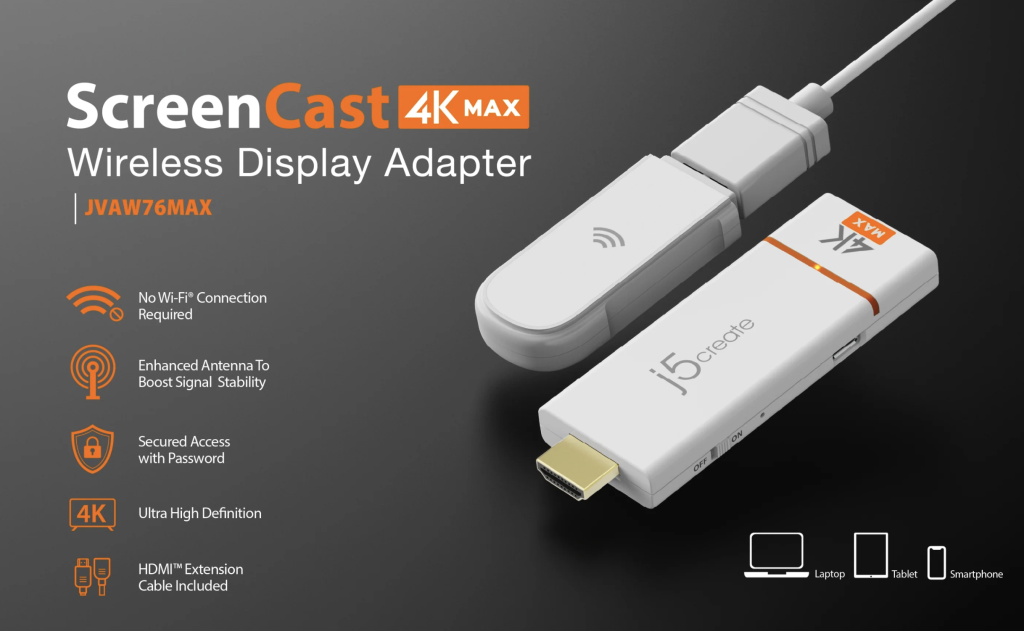 Bežično prikažite sadržaj s telefona, tableta ili prijenosnog računala na veći zaslon pomoću j5create ScreenCast 4K Max bežičnog adaptera za prikaz. Emitirajte na televizore, projektore i monitore. Sa svojom podrškom za više standarda bežičnog prikaza (Miracast™, AirPlay® i Chromecast™), ovaj bežični adapter za prikaz kompatibilan je s mobilnim uređajima koje već posjedujete, uključujući Windows®, macOS®, iOS®, Android™ i druga prijenosna računala, tablete i mobilne telefone koji podržavaju cast. Osim svog kompaktnog dizajna, ScreenCast 4K Max Wireless Display Adapter ima vanjsku antenu za poboljšanu pokrivenost signalom, što ga čini savršenim za kućnu upotrebu i putovanja.